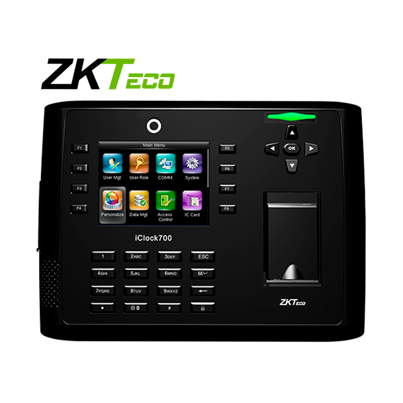 El iClock700 es un equipo para la gestión de tiempo y asistencia de empleados con funciones de control de acceso con pantalla TFT de 3.5 pulgadas. Gracias al nuevo firmware, el iClock700 incorpora nuevas características como una interfaz de usuario con mayor estabilidad, mayor velocidad de verificación y mejor rendimiento. El iClock700 es compatible con USB, ADMS y SDK. Los protocolos de comunicación TCP/IP, RS232/485 y USB-Host/Cliente garantizan una transmisión de datos fluida entre dispositivo y PC. También incorpora conexión vía GPRS, Wi-Fi, 3G y conectividad para el control de acceso mediante entrada y salida Wiegand, cerradura eléctrica, sensor de puerta, botón de salida, alarma y timbre.
